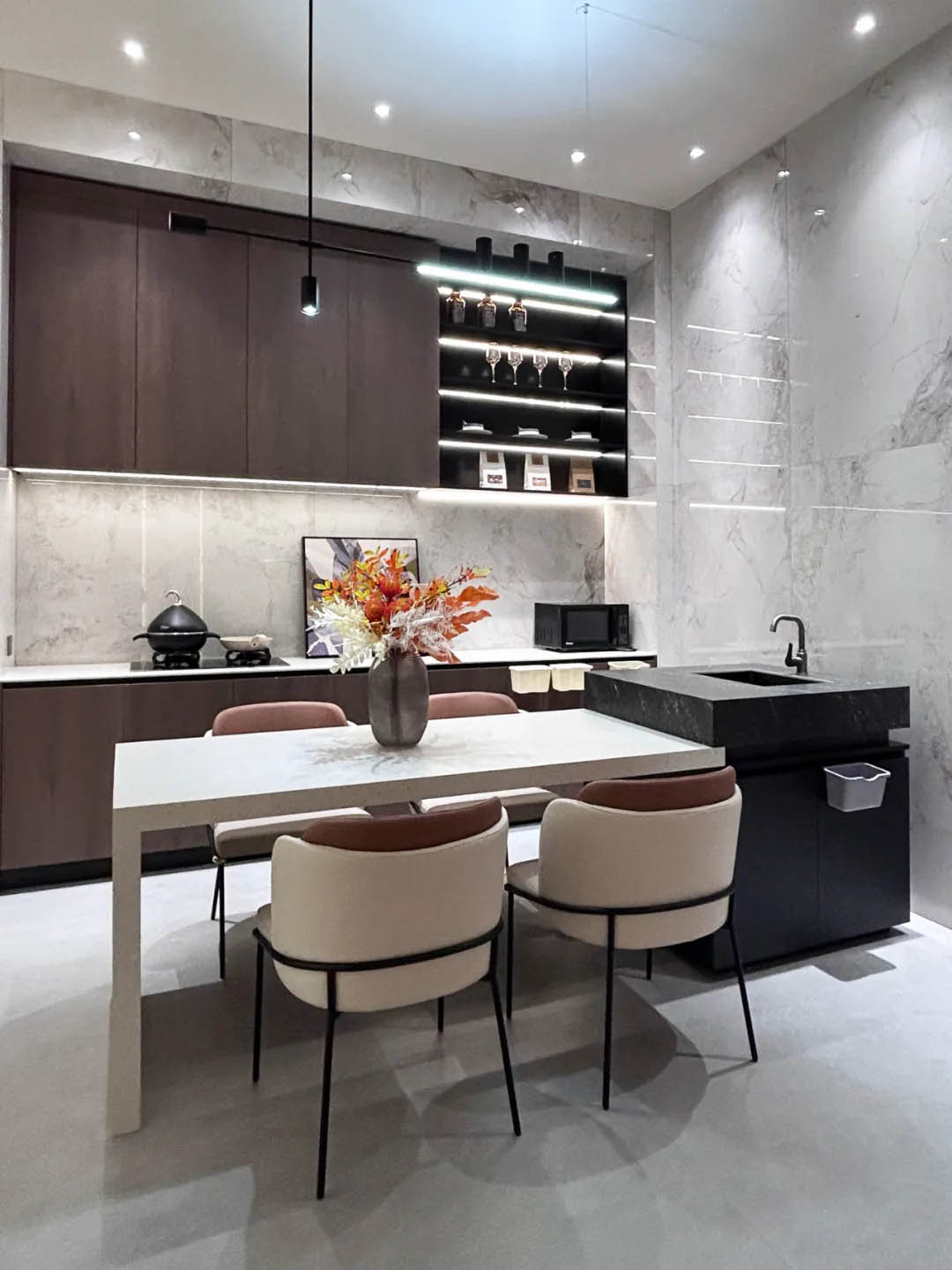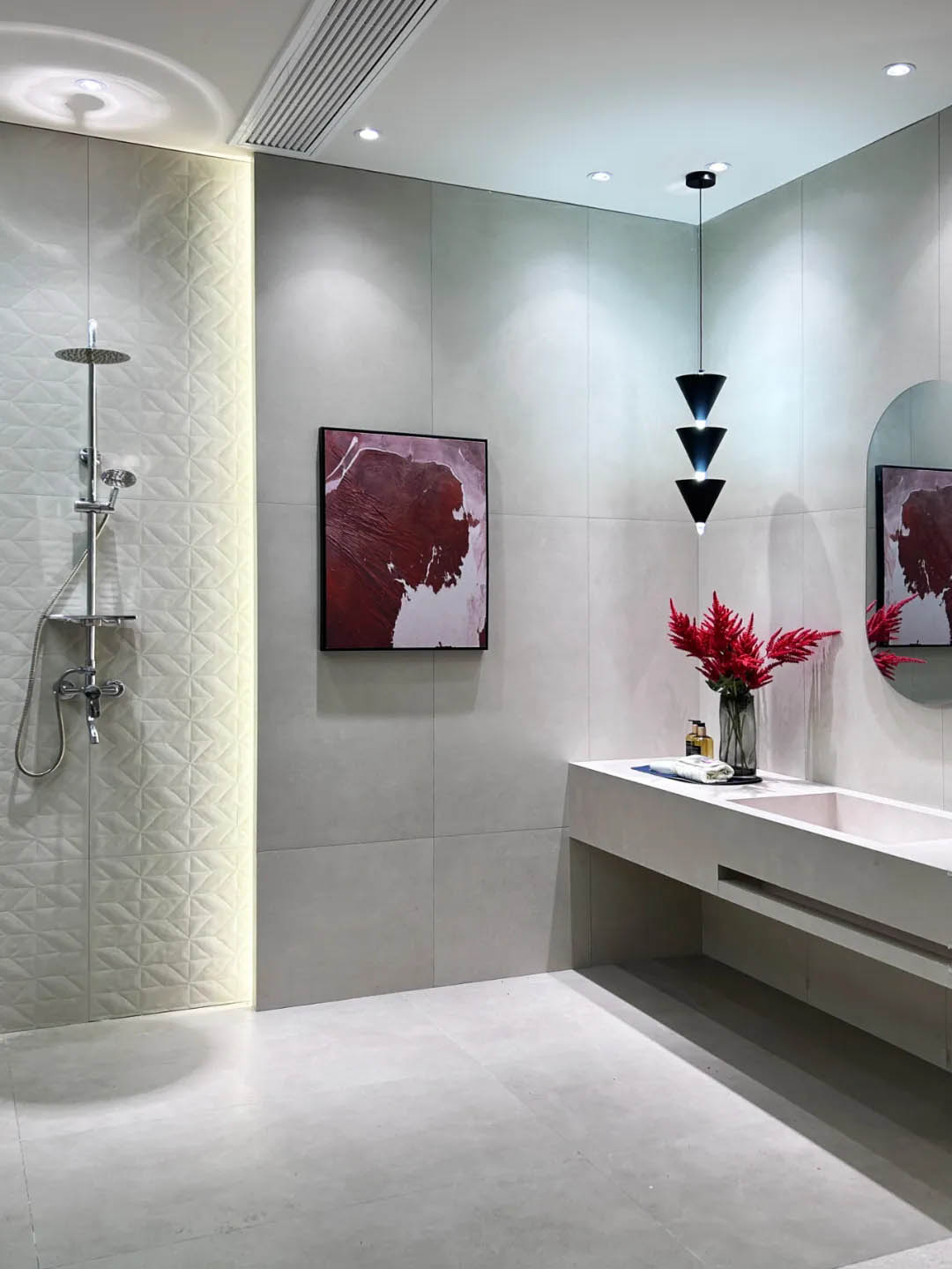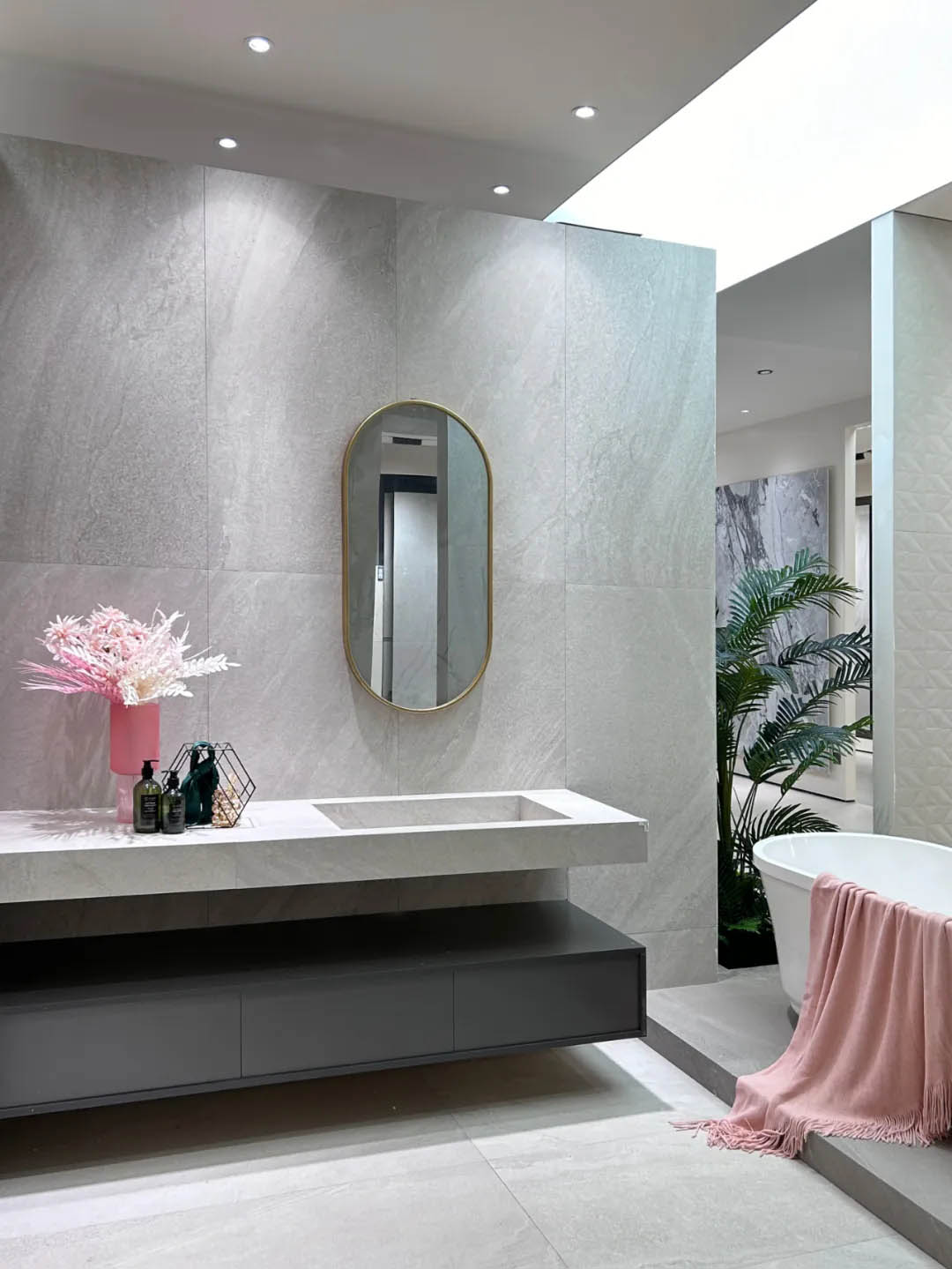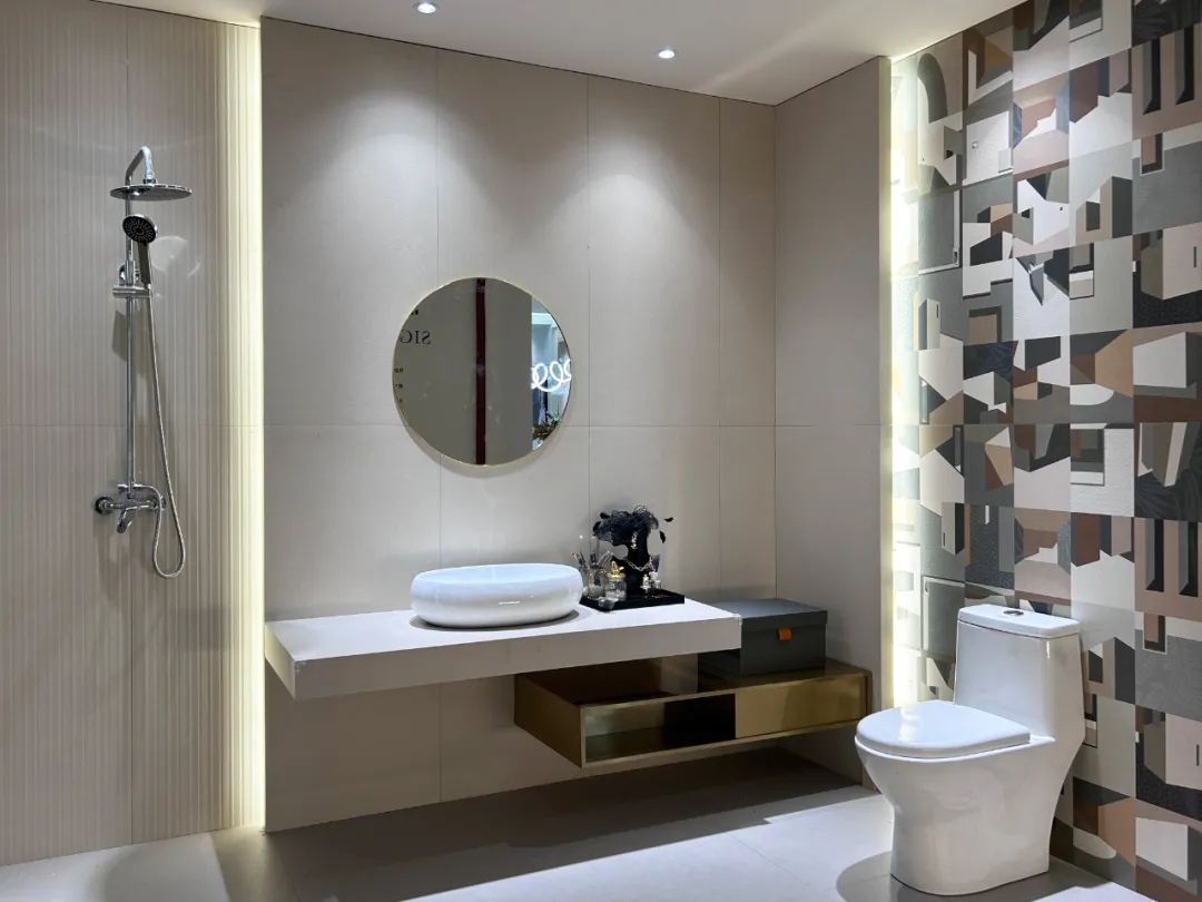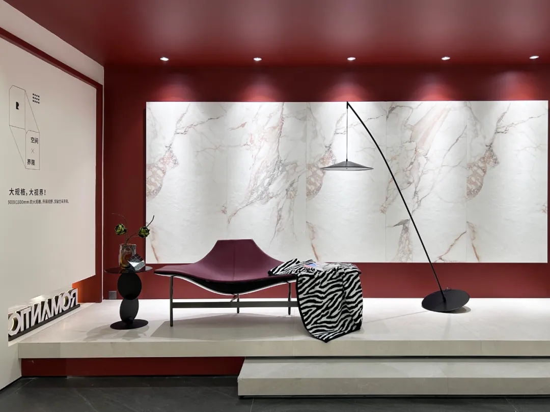 除了色彩與質感的搭配,鄭州羅曼締克店每個情景空間把產品展示極致,精雕細琢的瓷質底坯模具藝術磚,侘寂風溫柔質感的素色質感磚,時尚感肆意延伸的900x1800mm奐象系列等平衡了空間的冰冷感。置身其中,就算再澄澈的世界,也會心醉,讓人化身自然,忘卻自我,涅槃靈魂。