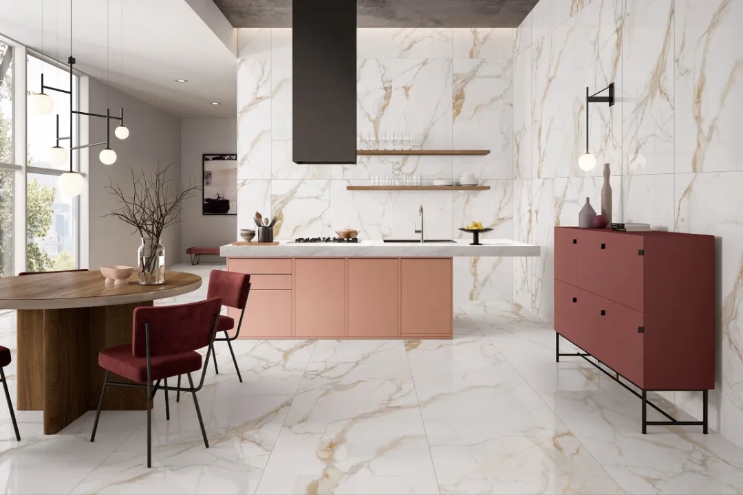 作為不可再生資源,【魚肚金】開采量有限,且市面上的原石品種繁雜、質量參差。為此,羅曼締克瓷磚推出了大理石【魚肚金Calacatta gold】,重現天然石材的頂奢之美。
