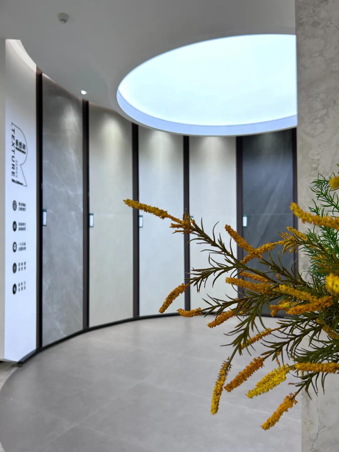從主接待臺進入大廳,利用光、色及序列感的交錯,以及半通透的形式去豐富材料展示區(qū)空間的層次。